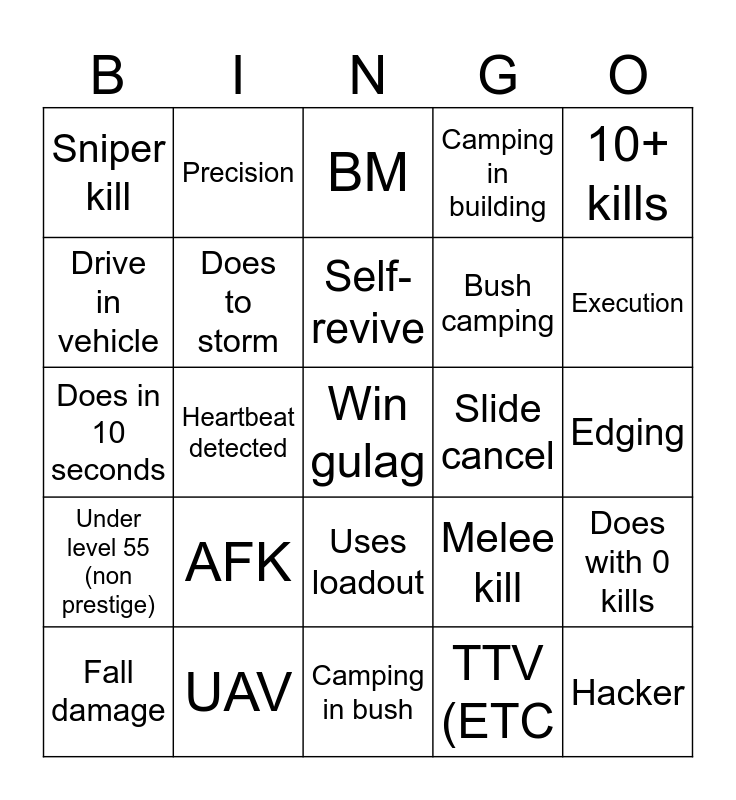 This bingo card has a free space and 24 words: AFK, UAV, Self-revive, Fall damage, 10+ kills, Sniper kill, Drive in vehicle, Precision, Slide cancel, Uses loadout, Bush camping, Does in 10 seconds, Melee kill, Does with 0 kills, Does to storm, TTV (ETC, Edging, BM, Execution, Heartbeat detected, Hacker, Under level 55 (non prestige), Camping in building and Camping in bush.