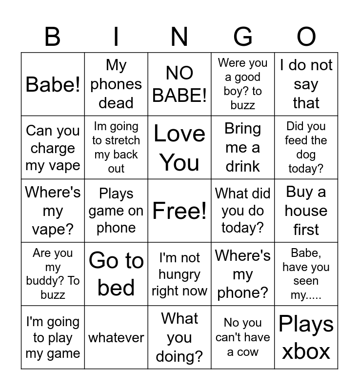 This bingo card has a free space and 24 words: Go to bed, whatever, Love You, I'm going to play my game, I do not say that, Babe!, Can you charge my vape, My phones dead, What did you do today?, I'm not hungry right now, Bring me a drink, Where's my vape?, Where's my phone?, Babe, have you seen my....., Im going to stretch my back out, No you can't have a cow, Buy a house first, NO BABE!, Did you feed the dog today?, Plays game on phone, Plays xbox, Are you my buddy? To buzz, Were you a good boy? to buzz and What you doing?.
