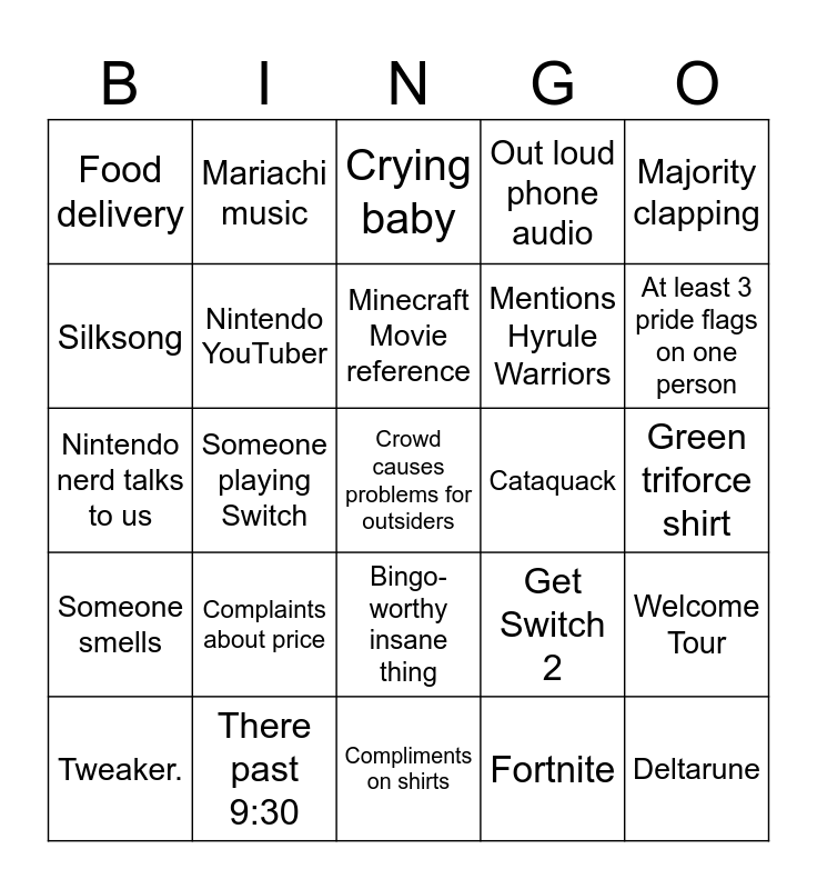 This bingo card has 25 words: Complaints about price, Compliments on shirts, Minecraft Movie reference, Tweaker., Majority clapping, Food delivery, Silksong, Mariachi music, Cataquack, Bingo-worthy insane thing, Mentions Hyrule Warriors, Nintendo nerd talks to us, Get Switch 2, Welcome Tour, Nintendo YouTuber, Deltarune, Green triforce shirt, Crying baby, At least 3 pride flags on one person, Someone playing Switch, Crowd causes problems for outsiders, There past 9:30, Someone smells, Out loud phone audio and Fortnite.