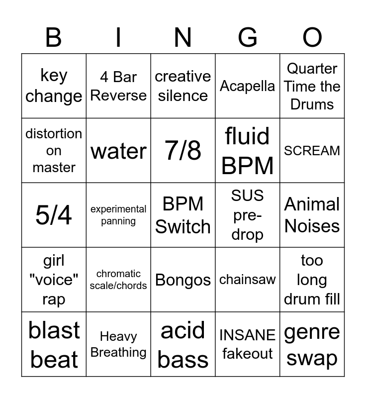 This bingo card has a free space and 24 words: chromatic scale/chords, Heavy Breathing, 7/8, blast beat, Quarter Time the Drums, key change, distortion on master, 4 Bar Reverse, SUS pre-drop, Bongos, fluid BPM, 5/4, chainsaw, too long drum fill, water, INSANE fakeout, Animal Noises, creative silence, SCREAM, experimental panning, genre swap, girl "voice" rap, Acapella and acid bass.
