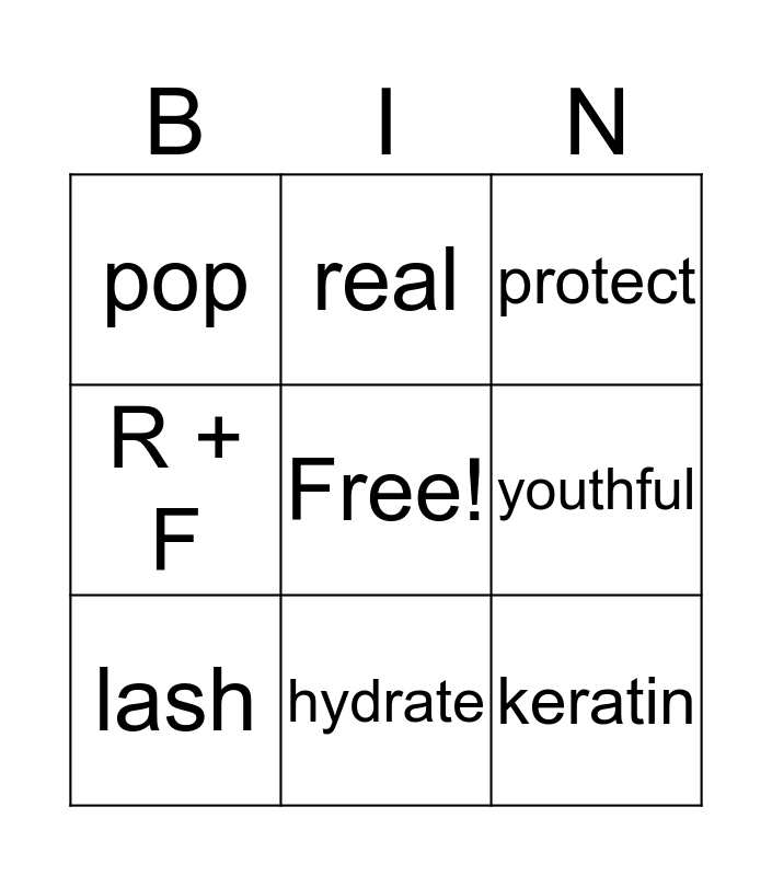This bingo card has a free space and 17 words: brows, boost, protect, pop, nourish, R + F, eyes, lash, hydrate, youthful, skincare, biotin, keratin, real, yours, serum and what if.