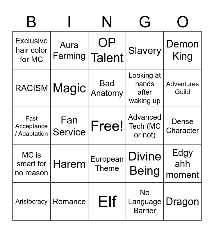 This bingo card has a free space and 24 words: Harem, Romance, Bad Anatomy, Aristocracy, Demon King, Exclusive hair color for MC, RACISM, Aura Farming, Advanced Tech (MC or not), European Theme, Looking at hands after waking up, Fast Acceptance / Adaptation, Divine Being, Edgy ahh moment, Magic, No Language Barrier, Dense Character, OP Talent, Adventures Guild, Fan Service, Dragon, MC is smart for no reason, Slavery and Elf.