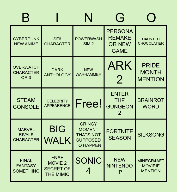 This bingo card has a free space and 24 words: BIG WALK, FNAF MOVIE 2 SECRET OF THE MIMIC, NEW WARHAMMER, FINAL FANTASY SOMETHING, HAUNTED CHOCOLATIER, CYBERPUNK NEW ANIME, OVERWATCH CHARACTER OR 3, SF6 CHARACTER, ENTER THE GUNGEON 2, CRINGY MOMENT THATS NOT SUPPOSED TO HAPPEN, ARK 2, STEAM CONSOLE, FORTNITE SEASON, SILKSONG, DARK ANTHOLOGY, NEW NINTENDO IP, BRAINROT WORD, POWERWASH SIM 2, PRIDE MONTH MENTION, CELEBRITY APPEARENCE, MINECR4AFT MOVIRIE MENTION, MARVEL RIVALS CHARACTER, PERSONA REMAKE OR NEW GAME and SONIC 4.