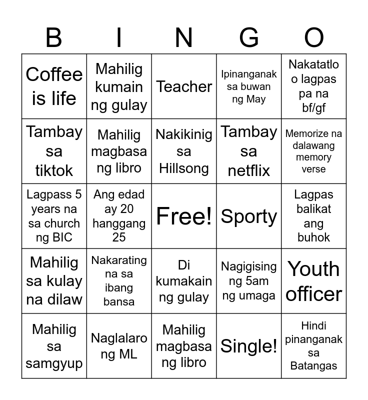 This bingo card has a free space and 39 words: Mahilig sa kulay na asul, Nakikinig kay Taylor Swift, Marunong magluto ng Pinoy dishes, Mahilig magbasa ng libro, Mahilig sa samgyup, Di kumakain ng gulay, Nakikinig sa Hillsong, Nakatugtog na ng any musical instruments, Nakatatlo o lagpas pa na bf/gf, Mahilig sa kulay na dilaw, Ang edad ay 20 hanggang 25, Ipinanganak sa buwan ng May, Hindi pinanganak sa Batangas, Lagpas balikat ang buhok, Sporty, Nakarating na sa ibang bansa, Mahilig manuod ng Anime, Coffee is life, Natutulog ng 10 pm ng gabi, Nagigising ng 5am ng umaga, Tambay sa tiktok, Mahilig magbasa ng libro, Tambay sa netflix, Memorize na dalawang memory verse, Nakapaligo na sa ulan, Ang paboritong prutas ay mangga, Kaliwete o left-handed, Panganay sa magkakapatid, Mahilig sa subject na Math, Mahilig kumain ng gulay, Free space, Bunso sa magkakapatid, Teacher, Naglalaro ng ML, Single!, Ate sa magkakapatid, Youth officer, Lagpass 5 years na sa church ng BIC and Honor student.
