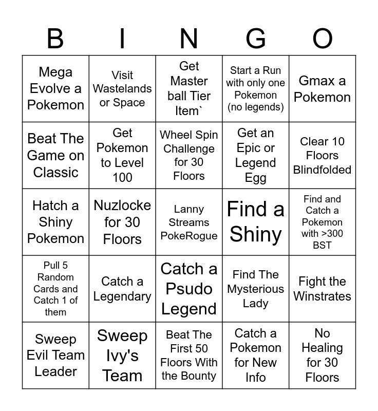 This bingo card has a free space and 24 words: Catch a Legendary, Sweep Ivy's Team, Wheel Spin Challenge for 30 Floors, Sweep Evil Team Leader, Gmax a Pokemon, Mega Evolve a Pokemon, Beat The Game on Classic, Visit Wastelands or Space, Find a Shiny, Catch a Psudo Legend, Get an Epic or Legend Egg, Hatch a Shiny Pokemon, Find The Mysterious Lady, Fight the Winstrates, Get Pokemon to Level 100, Catch a Pokemon for New Info, Find and Catch a Pokemon with >300 BST, Get Master ball Tier Item`, Clear 10 Floors Blindfolded, Nuzlocke for 30 Floors, No Healing for 30 Floors, Pull 5 Random Cards and Catch 1 of them, Start a Run with only one Pokemon (no legends) and Beat The First 50 Floors With the Bounty.
