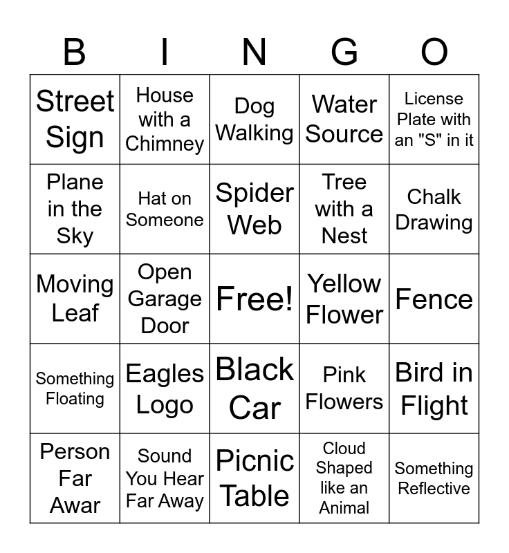 This bingo card has a free space and 28 words: Bird in Flight, Red Car, Tree with a Nest, Cloud Shaped like an Animal, Plane in the Sky, Dog Walking, House with a Chimney, Something Floating, Yellow Flower, Person Far Awar, Moving Leaf, Water Source, Sound You Hear Far Away, Picnic Table, Chalk Drawing, Flag, Eagles Logo, Hat on Someone, Spider Web, Black Car, Street Sign, Large Rock, Something Reflective, Open Garage Door, Fence, Pink Flowers, License Plate with an "S" in it and Mailbox.