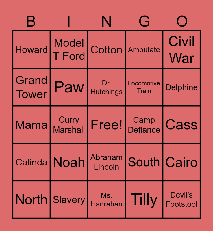 This bingo card has a free space and 24 words: Noah, Slavery, Dr. Hutchings, North, Civil War, Howard, Grand Tower, Model T Ford, Camp Defiance, Abraham Lincoln, Locomotive Train, Mama, South, Cairo, Paw, Tilly, Cass, Cotton, Delphine, Curry Marshall, Devil's Footstool, Calinda, Amputate and Ms. Hanrahan.