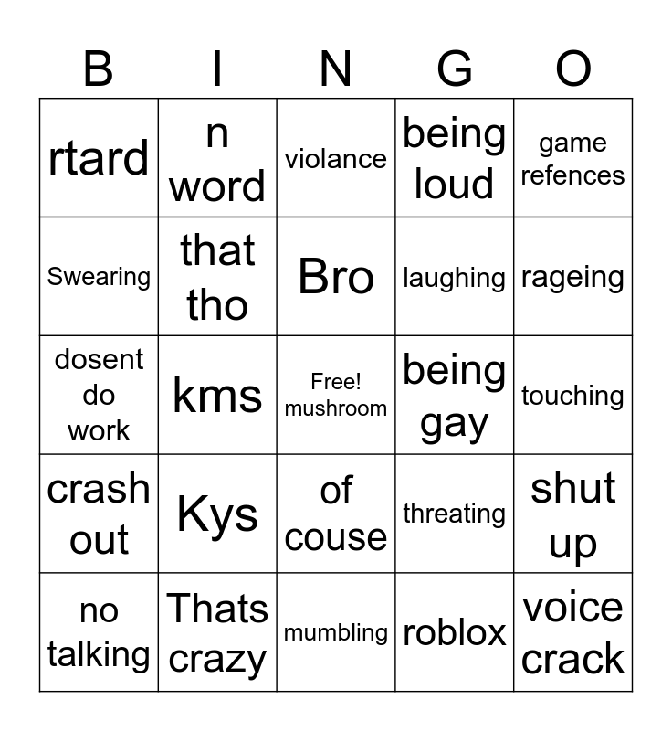 This bingo card has a free space and 24 words: Kys, Thats crazy, Bro, no talking, game refences, rtard, Swearing, n word, being gay, of couse, laughing, dosent do work, threating, shut up, that tho, roblox, touching, violance, rageing, kms, voice crack, crash out, being loud and mumbling.