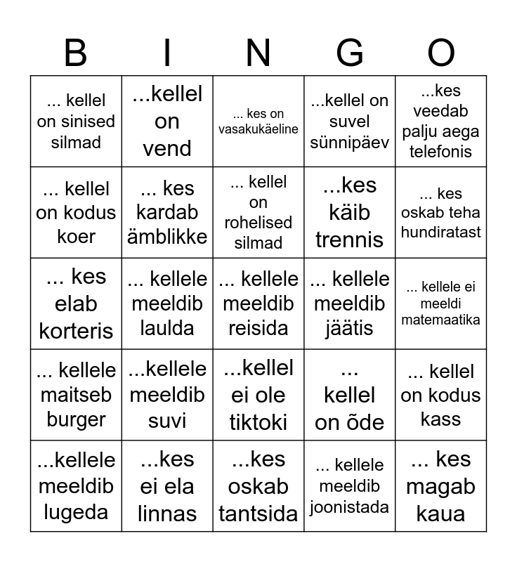 This bingo card has a free space and 24 words: ...kellele meeldib suvi, ...kes ei ela linnas, ... kellel on rohelised silmad, ...kellele meeldib lugeda, ...kes veedab palju aega telefonis, ... kellel on sinised silmad, ... kellel on kodus koer, ...kellel on vend, ... kellele meeldib jäätis, ...kellel ei ole tiktoki, ...kes käib trennis, ... kes elab korteris, ... kellel on õde, ... kellel on kodus kass, ... kes kardab ämblikke, ... kellele meeldib joonistada, ... kellele ei meeldi matemaatika, ... kes on vasakukäeline, ... kes oskab teha hundiratast, ... kellele meeldib laulda, ... kes magab kaua, ... kellele maitseb burger, ...kellel on suvel sünnipäev and ...kes oskab tantsida.