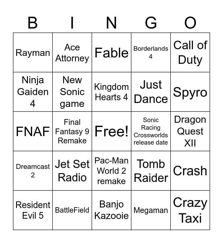 This bingo card has a free space and 24 words: Jet Set Radio, BattleField, Kingdom Hearts 4, Resident Evil 5, Call of Duty, Rayman, Ninja Gaiden 4, Ace Attorney, Sonic Racing Crossworlds release date, Pac-Man World 2 remake, Just Dance, FNAF, Tomb Raider, Crash, New Sonic game, Megaman, Dragon Quest XII, Fable, Spyro, Final Fantasy 9 Remake, Crazy Taxi, Dreamcast 2, Borderlands 4 and Banjo Kazooie.