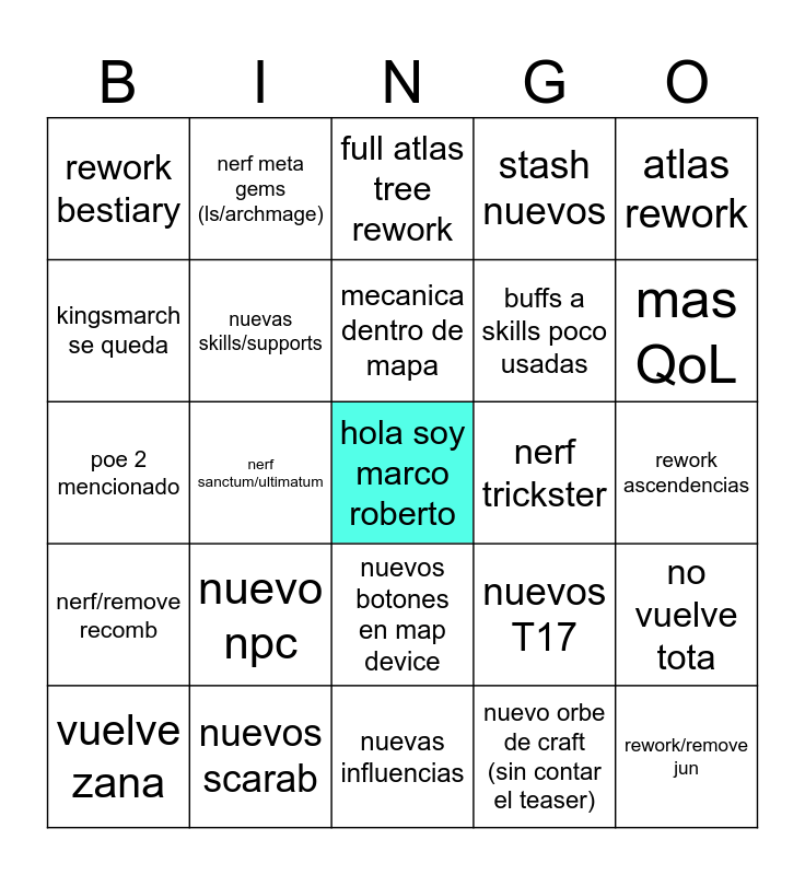 This bingo card has a free space and 24 words: nuevo npc, nuevos scarab, mecanica dentro de mapa, vuelve zana, atlas rework, rework bestiary, kingsmarch se queda, nerf meta gems (ls/archmage), nerf trickster, nuevos botones en map device, buffs a skills poco usadas, poe 2 mencionado, nuevos T17, no vuelve tota, nuevas skills/supports, nuevo orbe de craft (sin contar el teaser), rework ascendencias, full atlas tree rework, mas QoL, nerf sanctum/ultimatum, rework/remove jun, nerf/remove recomb, stash nuevos and nuevas influencias.