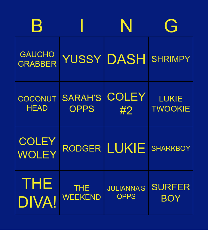 This bingo card has 16 words: THE DIVA!, THE WEEKEND, DASH, SHRIMPY, COCONUT HEAD, YUSSY, LUKIE, SHARKBOY, GAUCHO GRABBER, SARAH’S OPPS, JULIANNA’S OPPS, LUKIE TWOOKIE, COLEY WOLEY, RODGER, COLEY #2 and SURFER BOY.