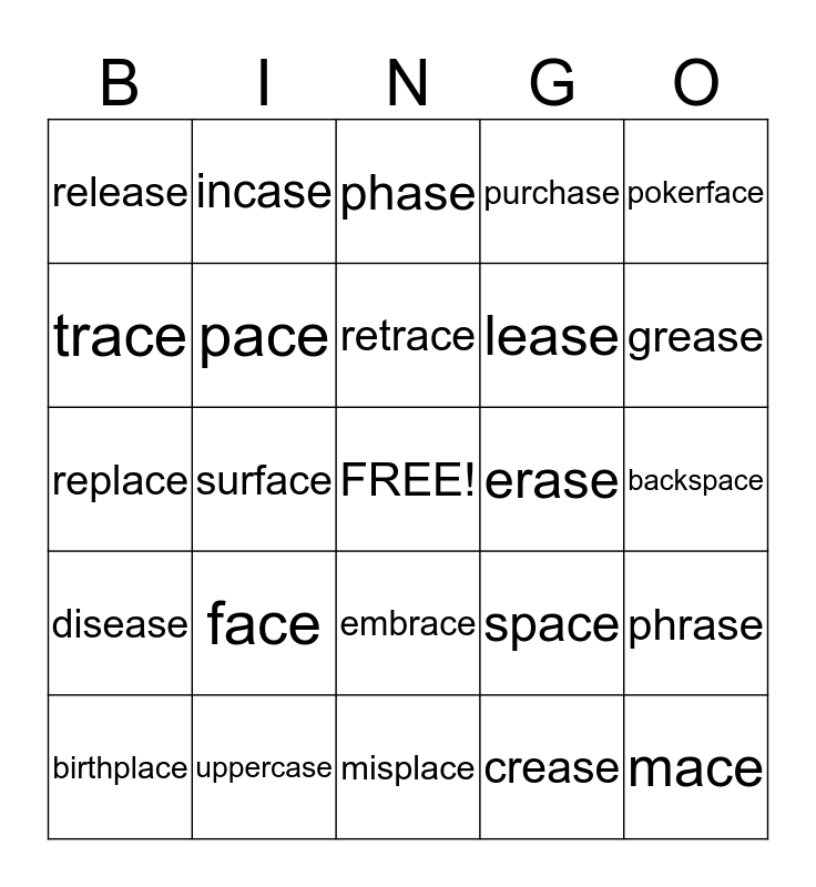 This bingo card has a free space and 24 words: face, uppercase, retrace, birthplace, pokerface, release, trace, incase, erase, embrace, lease, replace, space, phrase, pace, crease, backspace, phase, grease, surface, mace, disease, purchase and misplace.