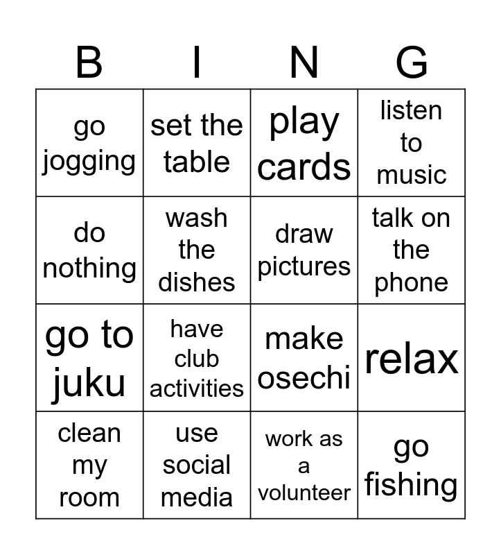 This bingo card has 49 words: Free!, clean my room, clear the table, cook breakfast, get the newspaper, help my mother, set the table, take out the garbage, wash the dishes, bake a cake, draw pictures, listen to music, make a robot, play video games, read books, send emails to my friends, talk on the phone, use social media, write in my diary, do nothing, relax, take a nap, go jogging, go to juku, go to my friend's house, have club activities, skateboard, swim in a pool, go camping, go fishing, go skating [skiing], go to a concert, go to Australia, have a barbecue, have a party, see a parade, stay up late, visit my grandparents, work as a volunteer, go to a summer festival, join a bon-odori, see fireworks, set off fireworks, wear a yukata, make osechi, play cards, see the sunrise, visit a shrine [temple] and write New Year's cards.