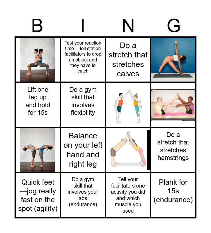 This bingo card has 6 images and 10 words: Do a gym skill that involves your abs (endurance), Do a stretch that stretches hamstrings, Do a stretch that stretches calves, Test your reaction time —tell station facilitators to drop an object and they have to catch, Tell your facilitators one activity you did and which muscle you used, Lift one leg up and hold for 15s, Do a gym skill that involves flexibility, Quick feet —jog really fast on the spot (agility), Balance on your left hand and right leg and Plank for 15s (endurance).