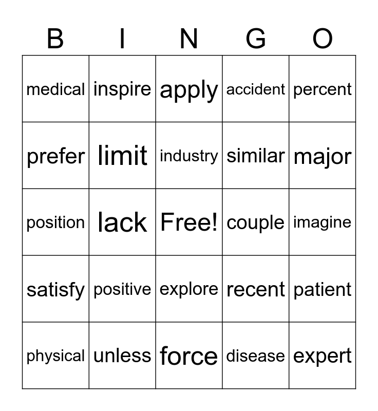This bingo card has a free space and 26 words: explore, disease, industry, unless, percent, medical, prefer, inspire, imagine, recent, similar, position, patient, physical, lack, condition, accident, satisfy, apply, expert, major, force, couple, positive, limit and immediately.