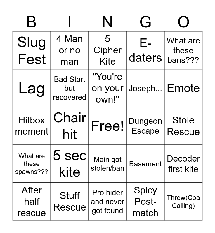 This bingo card has a free space and 24 words: 5 sec kite, Stuff Rescue, "You're on your own!", After half rescue, What are these bans???, Slug Fest, Lag, 4 Man or no man, Dungeon Escape, Main got stolen/ban, Joseph..., Hitbox moment, Basement, Decoder first kite, Bad Start but recovered, Spicy Post-match, Stole Rescue, 5 Cipher Kite, Emote, Chair hit, Threw(Coa Calling), What are these spawns???, E-daters and Pro hider and never got found.