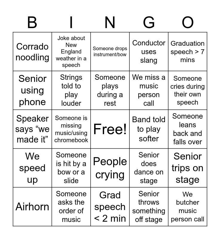 This bingo card has a free space and 27 words: Senior does dance on stage, Someone’s name is butchered, We miss a music person call, Grad speech < 2 min, Senior using phone, Someone drops instrument/bow, Joke about New England weather in a speech, We speed up, Band told to play softer, Senior trips on stage, Speaker says “we made it”, Conductor uses slang, Airhorn, Someone asks the order of music, Someone cries during their own speech, Speaker says “I’ll make this one short”, Strings told to play louder, Someone plays during a rest, Someone is hit by a bow or a slide, Corrado noodling, Someone leans back and falls over, Senior throws something off stage, Someone is missing music/using chromebook, We butcher music person call, People crying, Graduation speech > 7 mins and Obscure metaphor.