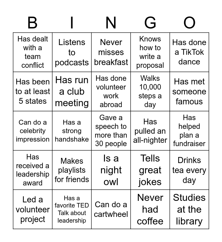 This bingo card has a free space and 25 words: Makes playlists for friends, Can do a cartwheel, Has done volunteer work abroad, Led a volunteer project, Has done a TikTok dance, Has dealt with a team conflict, Has been to at least 5 states, Listens to podcasts, Has pulled an all-nighter, Is a night owl, Walks 10,000 steps a day, Can do a celebrity impression, Tells great jokes, Drinks tea every day, Has run a club meeting, Watches a TV show religiously, Has helped plan a fundraiser, Never misses breakfast, Has met someone famous, Has a strong handshake, Studies at the library, Has a favorite TED Talk about leadership, Has received a leadership award, Knows how to write a proposal and Never had coffee.