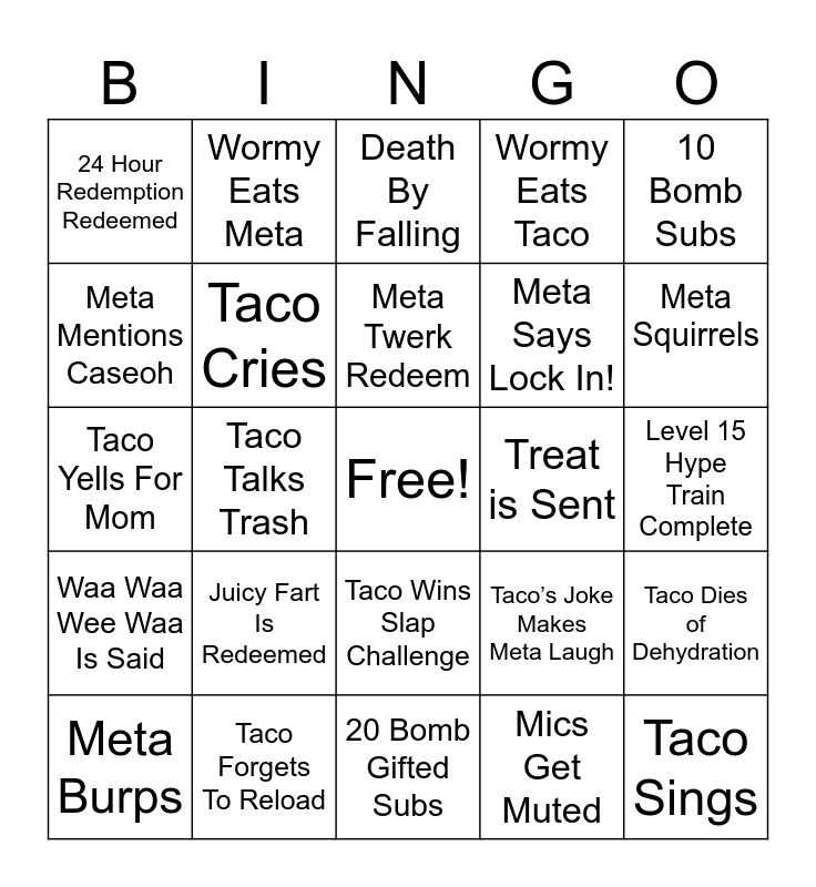 This bingo card has a free space and 36 words: TTS is Used, Taco Dies In Game, Meta Says Let’s Freaking Go, Taco Cries, Taco’s Joke Makes Meta Laugh, Waa Waa Wee Waa Is Said, Meta Twerk Redeem, Taco Shoots A Friend, 10 Bomb Subs, 500 Bit Donation, Taco Talks Trash, Wormy Eats Taco, Meta Lands Flip, Treat is Sent, Meta Squirrels, 24 Hour Redemption Redeemed, Meta Wins Slap Challenge, Juicy Fart Is Redeemed, Taco Sings, Death By Falling, Level 15 Hype Train Complete, Taco Dies of Dehydration, Taco Forgets To Reload, Meta Burps, 20 Bomb Gifted Subs, Wormy Eats Meta, Taco Yells For Mom, Taco Lands Flip, Meta Says Lock In!, Meta Mentions Caseoh, Bob Gets Yelled At, Taco Sneezes, Mics Get Muted, Taco Wins Slap Challenge, Level 10 Hype Train Complete and Drinks a Goat Fuel.