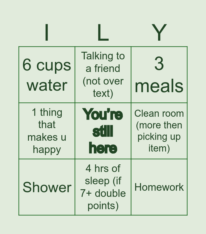 This bingo card has a free space and 10 words: 4 hrs of sleep (if 7+ double points), 3 meals, 6 cups water, Homework, 1 thing that makes u happy, Shower, Talking to a friend (not over text), Nothing. Just do nothing for like 15 min (preferably outside), Clean room (more then picking up item) and Brush teeth (twice).