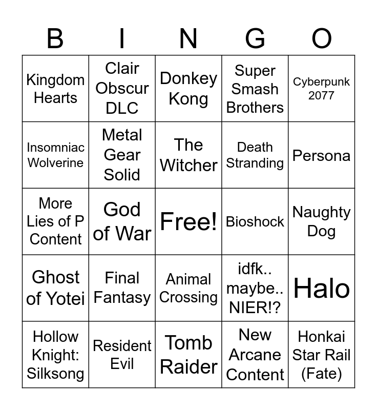 This bingo card has a free space and 24 words: Final Fantasy, Resident Evil, The Witcher, Hollow Knight: Silksong, Cyberpunk 2077, Kingdom Hearts, Insomniac Wolverine, Clair Obscur DLC, Bioshock, Animal Crossing, Death Stranding, More Lies of P Content, idfk.. maybe.. NIER!?, Halo, Metal Gear Solid, New Arcane Content, Naughty Dog, Donkey Kong, Persona, God of War, Honkai Star Rail (Fate), Ghost of Yotei, Super Smash Brothers and Tomb Raider.