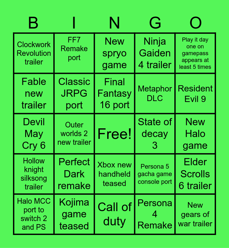 This bingo card has a free space and 24 words: Perfect Dark remake, Kojima game teased, Final Fantasy 16 port, Halo MCC port to switch 2 and PS, Play it day one on gamepass appears at least 5 times, Clockwork Revolution trailer, Fable new trailer, FF7 Remake port, State of decay 3, Xbox new handheld teased, Metaphor DLC, Devil May Cry 6, Persona 5 gacha game console port, Elder Scrolls 6 trailer, Classic JRPG port, Persona 4 Remake, New Halo game, New spryo game, Resident Evil 9, Outer worlds 2 new trailer, New gears of war trailer, Hollow knight silksong trailer, Ninja Gaiden 4 trailer and Call of duty.