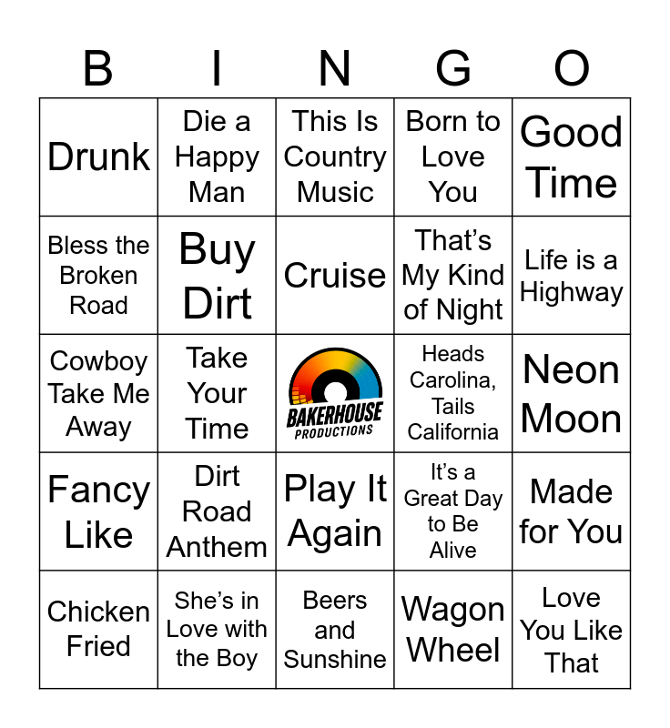 This bingo card has a free space and 34 words: Tennessee Whiskey, Wagon Wheel, Take Me Home, Country Roads, Man! I Feel Like a Woman!, Fancy Like, Buy Dirt, Good Time, Chicken Fried, Die a Happy Man, American Honey, Cruise, This Is Country Music, Forever After All, Body Like a Back Road, Heads Carolina, Tails California, Life is a Highway, She’s in Love with the Boy, Cowboy Take Me Away, Dirt Road Anthem, It’s a Great Day to Be Alive, Play It Again, My Front Porch Looking In, Drunk, Neon Moon, Beers and Sunshine, Love You Like That, Born to Love You, I Don’t Dance, That’s My Kind of Night, Bless the Broken Road, 19 You + Me, Take Your Time, Made for You and Heart Like a Truck.