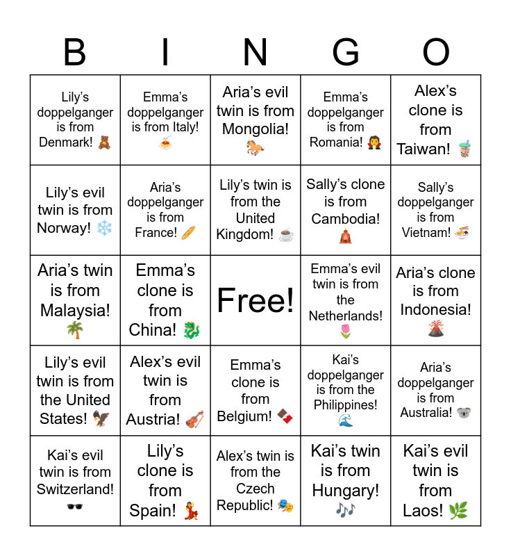 This bingo card has a free space and 33 words: Alex’s evil twin is from Japan! 🎌, Kai’s doppelganger is from Canada! 🍁, Emma’s clone is from China! 🐉, Sally’s twin is from Germany! 🏰, Lily’s evil twin is from the United States! 🦅, Aria’s doppelganger is from France! 🥖, Alex’s clone is from Taiwan! 🧋, Kai’s evil twin is from Switzerland! 🕶️, Emma’s doppelganger is from Italy! 🍝, Sally’s clone is from Hong Kong! 🌆, Lily’s twin is from the United Kingdom! ☕, Aria’s evil twin is from Mongolia! 🐎, Alex’s doppelganger is from Ireland! 🍀, Kai’s clone is from Singapore! 🦁, Emma’s evil twin is from the Netherlands! 🌷, Sally’s doppelganger is from Vietnam! 🍜, Lily’s clone is from Spain! 💃, Aria’s twin is from Malaysia! 🌴, Alex’s evil twin is from Austria! 🎻, Kai’s doppelganger is from the Philippines! 🌊, Emma’s clone is from Belgium! 🍫, Sally’s evil twin is from Thailand! 🐘, Lily’s doppelganger is from Denmark! 🧸, Aria’s clone is from Indonesia! 🌋, Alex’s twin is from the Czech Republic! 🎭, Kai’s evil twin is from Laos! 🌿, Emma’s doppelganger is from Romania! 🧛, Sally’s clone is from Cambodia! 🛕, Lily’s evil twin is from Norway! ❄️, Aria’s doppelganger is from Australia! 🐨, Alex’s clone is from Bhutan! 🏔️, Kai’s twin is from Hungary! 🎶 and Emma’s evil twin is from New Zealand! 🐑.