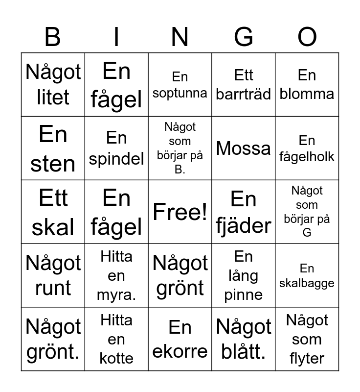This bingo card has a free space and 24 words: Hitta en myra., Hitta en kotte, Något som börjar på B., Något grönt., En blomma, Något litet, En sten, En fågel, En fjäder, Något grönt, Mossa, Ett skal, En lång pinne, En skalbagge, En spindel, Något blått., Något som börjar på G, En soptunna, En fågelholk, En fågel, Något som flyter, Något runt, Ett barrträd and En ekorre.