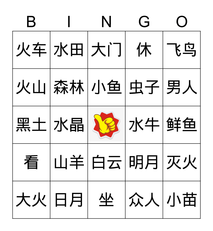 This bingo card has a free space and 24 words: 山羊, 日月, 小鱼, 大火, 飞鸟, 火车, 火山, 水田, 水牛, 白云, 虫子, 黑土, 明月, 灭火, 森林, 众人, 鲜鱼, 大门, 男人, 水晶, 小苗, 看, 休 and 坐.
