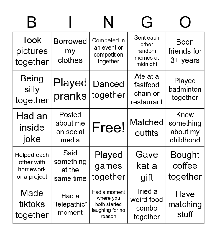 This bingo card has a free space and 24 words: Said something at the same time, Had a “telepathic” moment, Danced together, Made tiktoks together, Been friends for 3+ years, Took pictures together, Being silly together, Borrowed my clothes, Matched outfits, Played games together, Ate at a fastfood chain or restaurant, Had an inside joke, Gave kat a gift, Bought coffee together, Played pranks, Tried a weird food combo together, Knew something about my childhood, Competed in an event or competition together, Played badminton together, Posted about me on social media, Have matching stuff, Helped each other with homework or a project, Sent each other random memes at midnight and Had a moment where you both started laughing for no reason.