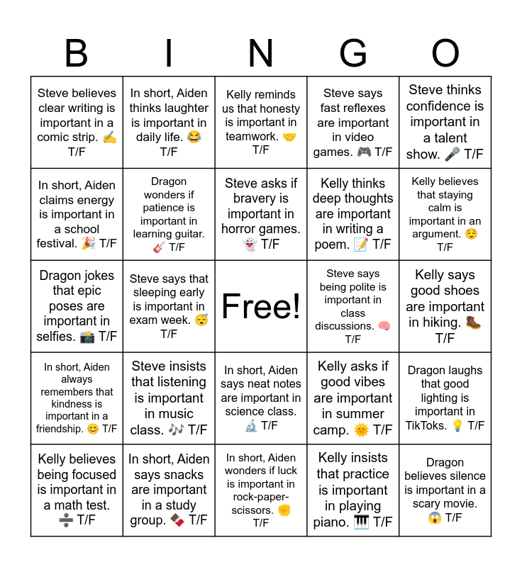 This bingo card has a free space and 33 words: In short, Aiden knows that teamwork is important in dodgeball. 🏐 T/F, Dragon believes that good snacks are important in a movie marathon. 🍿 T/F, Steve says that sleeping early is important in exam week. 😴 T/F, Kelly thinks being creative is important in art class. 🎨 T/F, In short, Aiden always remembers that kindness is important in a friendship. 😊 T/F, Dragon wonders if patience is important in learning guitar. 🎸 T/F, Steve thinks confidence is important in a talent show. 🎤 T/F, Kelly believes being focused is important in a math test. ➗ T/F, In short, Aiden thinks laughter is important in daily life. 😂 T/F, Dragon always says that timing is important in a prank. 😜 T/F, Steve asks if bravery is important in horror games. 👻 T/F, Kelly reminds us that honesty is important in teamwork. 🤝 T/F, In short, Aiden says stretching is important in P.E. 🏃♂️ T/F, Dragon laughs that cool clothes are important in a K-pop audition. 💃 T/F, Steve says being polite is important in class discussions. 🧠 T/F, Kelly believes that staying calm is important in an argument. 😌 T/F, In short, Aiden says snacks are important in a study group. 🍫 T/F, Dragon jokes that epic poses are important in selfies. 📸 T/F, Steve insists that listening is important in music class. 🎶 T/F, Kelly asks if good vibes are important in summer camp. 🌞 T/F, In short, Aiden says neat notes are important in science class. 🔬 T/F, Dragon thinks funny voices are important in reading aloud. 📚 T/F, Steve believes clear writing is important in a comic strip. ✍️ T/F, Kelly says good shoes are important in hiking. 🥾 T/F, In short, Aiden wonders if luck is important in rock-paper-scissors. ✊ T/F, Dragon believes silence is important in a scary movie. 😱 T/F, Steve says fast reflexes are important in video games. 🎮 T/F, Kelly thinks deep thoughts are important in writing a poem. 📝 T/F, In short, Aiden claims energy is important in a school festival. 🎉 T/F, Dragon laughs that good lighting is important in TikToks. 💡 T/F, Steve believes balance is important in riding a bike. 🚲 T/F, Kelly insists that practice is important in playing piano. 🎹 T/F and In short, Aiden says imagination is important in storytelling. 🐉 T/F.