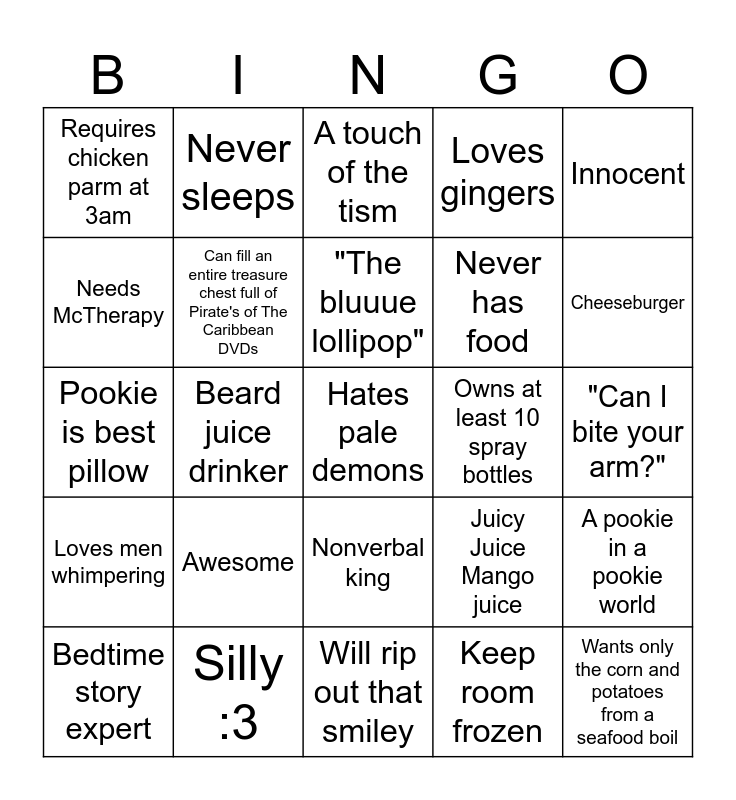 This bingo card has a free space and 24 words: Awesome, Silly :3, "The bluuue lollipop", Bedtime story expert, Innocent, Requires chicken parm at 3am, Needs McTherapy, Never sleeps, Owns at least 10 spray bottles, Nonverbal king, Never has food, Pookie is best pillow, Juicy Juice Mango juice, A pookie in a pookie world, Can fill an entire treasure chest full of Pirate's of The Caribbean DVDs, Keep room frozen, "Can I bite your arm?", A touch of the tism, Cheeseburger, Beard juice drinker, Wants only the corn and potatoes from a seafood boil, Loves men whimpering, Loves gingers and Will rip out that smiley.