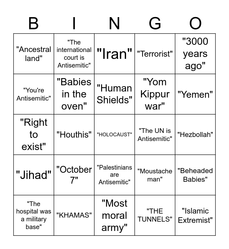 This bingo card has a free space and 24 words: "October 7", "KHAMAS", "Human Shields", "The hospital was a military base", "3000 years ago", "Ancestral land", "You're Antisemitic", "The international court is Antisemitic", "The UN is Antisemitic", "Palestinians are Antisemitic", "Yom Kippur war", "Right to exist", "Moustache man", "Beheaded Babies", "Babies in the oven", "THE TUNNELS", "Hezbollah", "Iran", "Yemen", "Houthis", "Islamic Extremist", "Jihad", "Terrorist" and "Most moral army".