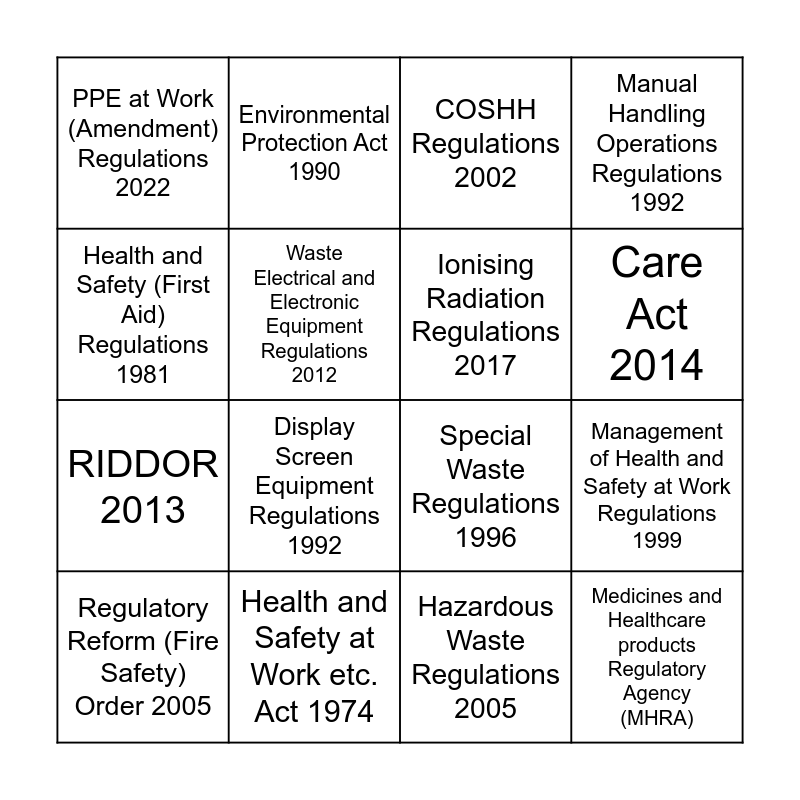 This bingo card has 16 words: Health and Safety at Work etc. Act 1974, Management of Health and Safety at Work Regulations 1999, COSHH Regulations 2002, PPE at Work (Amendment) Regulations 2022, RIDDOR 2013, Environmental Protection Act 1990, Special Waste Regulations 1996, Hazardous Waste Regulations 2005, Health and Safety (First Aid) Regulations 1981, Waste Electrical and Electronic Equipment Regulations 2012, Regulatory Reform (Fire Safety) Order 2005, Manual Handling Operations Regulations 1992, Display Screen Equipment Regulations 1992, Care Act 2014, Ionising Radiation Regulations 2017 and Medicines and Healthcare products Regulatory Agency (MHRA).