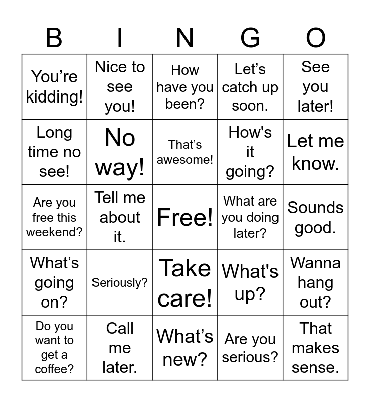 This bingo card has a free space and 27 words: What's up?, How are you?, How's it going?, What’s new?, Long time no see!, How have you been?, Nice to see you!, What’s going on?, What are you doing later?, Wanna hang out?, Are you free this weekend?, Let’s catch up soon., Do you want to get a coffee?, Call me later., Let me know., What time works for you?, No way!, That’s awesome!, Seriously?, You’re kidding!, Sounds good., Are you serious?, Tell me about it., That makes sense., Take care!, See you later! and I’m just chilling..