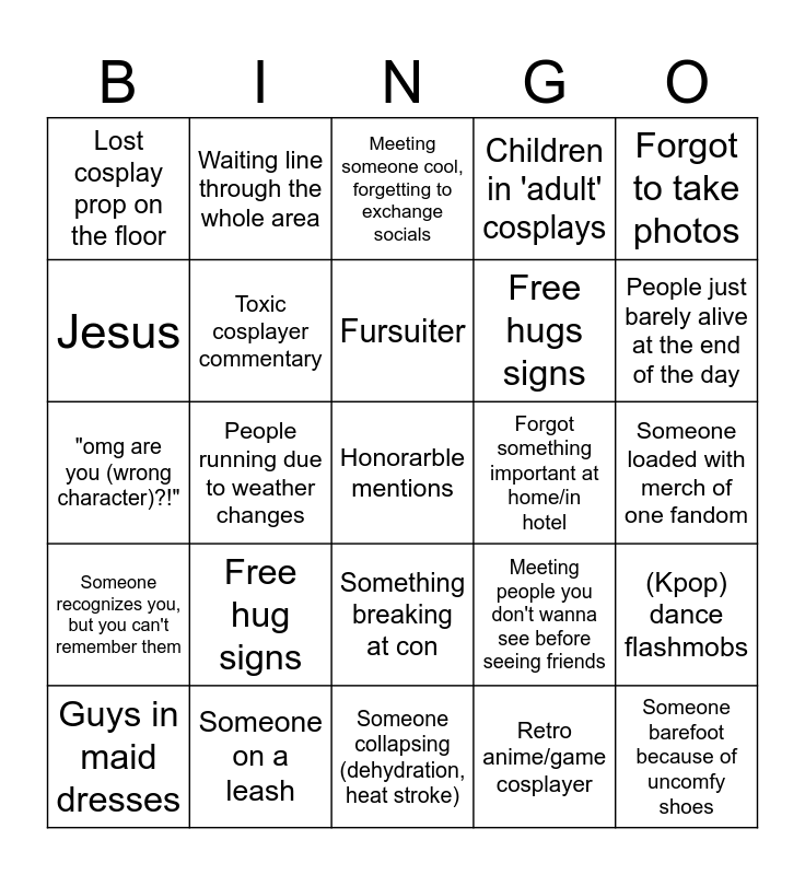 This bingo card has a free space and 24 words: Free hug signs, Someone on a leash, Fursuiter, Guys in maid dresses, Forgot to take photos, Lost cosplay prop on the floor, Jesus, Waiting line through the whole area, Forgot something important at home/in hotel, Something breaking at con, Free hugs signs, "omg are you (wrong character)?!", Meeting people you don't wanna see before seeing friends, (Kpop) dance flashmobs, Toxic cosplayer commentary, Retro anime/game cosplayer, Someone loaded with merch of one fandom, Meeting someone cool, forgetting to exchange socials, People just barely alive at the end of the day, People running due to weather changes, Someone barefoot because of uncomfy shoes, Someone recognizes you, but you can't remember them, Children in 'adult' cosplays and Someone collapsing (dehydration, heat stroke).