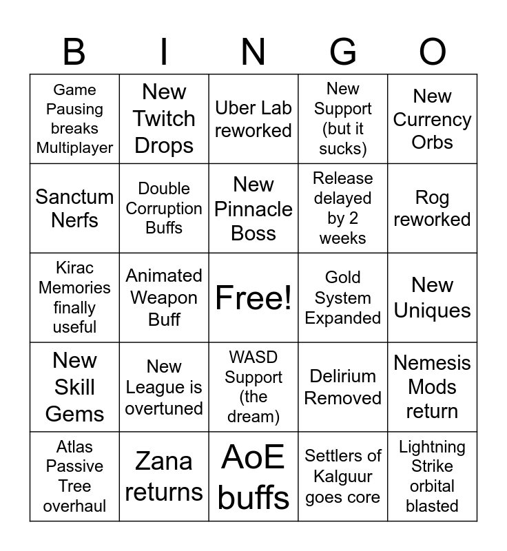This bingo card has a free space and 24 words: New League is overtuned, Zana returns, New Pinnacle Boss, Atlas Passive Tree overhaul, New Currency Orbs, Game Pausing breaks Multiplayer, Sanctum Nerfs, New Twitch Drops, Gold System Expanded, WASD Support (the dream), Release delayed by 2 weeks, Kirac Memories finally useful, Delirium Removed, Nemesis Mods return, Double Corruption Buffs, Settlers of Kalguur goes core, New Uniques, Uber Lab reworked, Rog reworked, Animated Weapon Buff, Lightning Strike orbital blasted, New Skill Gems, New Support (but it sucks) and AoE buffs.