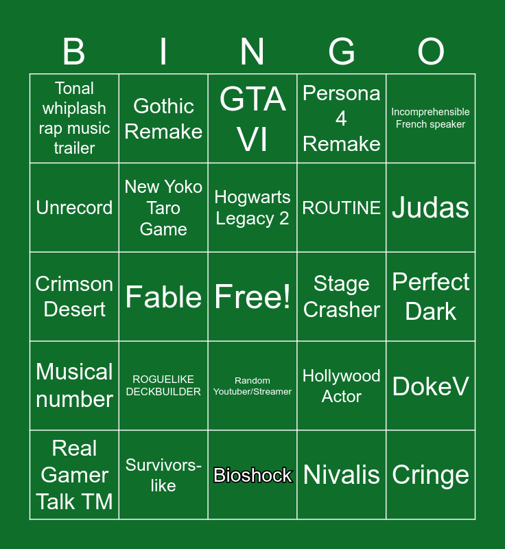 This bingo card has a free space and 24 words: ROGUELIKE DECKBUILDER, Survivors-like, Hogwarts Legacy 2, Real Gamer Talk TM, Incomprehensible French speaker, Tonal whiplash rap music trailer, Unrecord, Gothic Remake, Stage Crasher, Random Youtuber/Streamer, ROUTINE, Crimson Desert, Hollywood Actor, DokeV, New Yoko Taro Game, Nivalis, Perfect Dark, GTA VI, Judas, Fable, Cringe, Musical number, Persona 4 Remake and Bioshock.