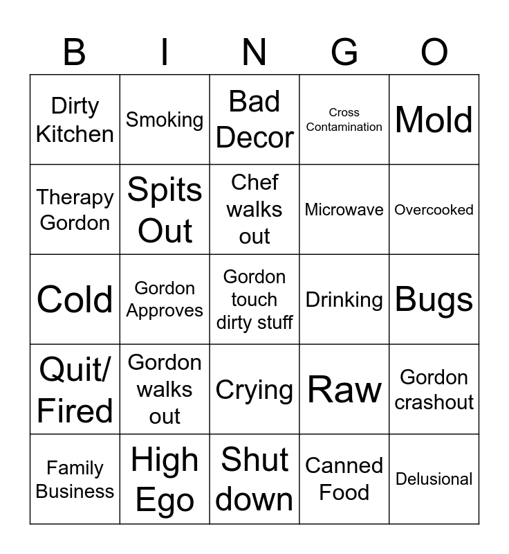 This bingo card has 25 words: Gordon walks out, Shut down, Chef walks out, Family Business, Mold, Dirty Kitchen, Therapy Gordon, Smoking, Drinking, Crying, Microwave, Cold, Raw, Gordon crashout, Spits Out, Delusional, Bugs, Bad Decor, Overcooked, Gordon Approves, Gordon touch dirty stuff, High Ego, Quit/ Fired, Cross Contamination and Canned Food.