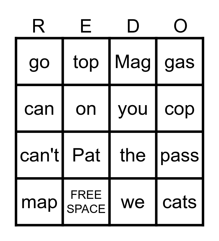 This bingo card has 20 words: pass, got, Mag, stop, map, can, FREE SPACE, go, can't, top, Pat, the, on, cats, you, I, cop, gas, we and man.