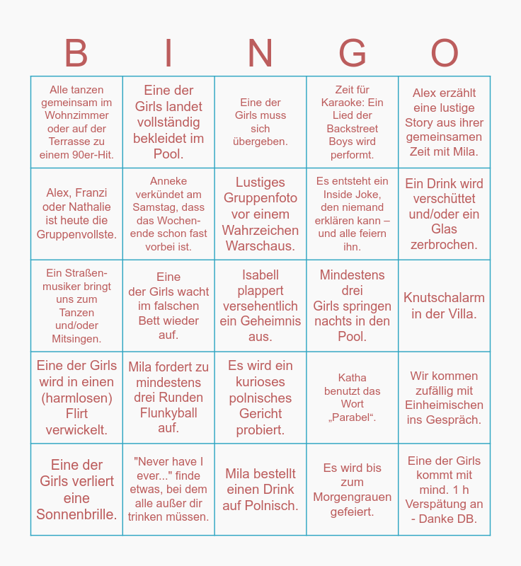 This bingo card has 25 words: Mila fordert zu mindestens drei Runden Flunkyball auf., Mila bestellt einen Drink auf Polnisch., Lustiges Gruppenfoto vor einem Wahrzeichen Warschaus., Eine der Girls verliert eine Sonnenbrille., Alex erzählt eine lustige Story aus ihrer gemeinsamen Zeit mit Mila., Alle tanzen gemeinsam im Wohnzimmer oder auf der Terrasse zu einem 90er-Hit., Alex, Franzi oder Nathalie ist heute die Gruppenvollste., Eine der Girls landet vollständig bekleidet im Pool., Mindestens drei Girls springen nachts in den Pool., Es wird ein kurioses polnisches Gericht probiert., Es entsteht ein Inside Joke, den niemand erklären kann – und alle feiern ihn., Ein Straßen-musiker bringt uns zum Tanzen und/oder Mitsingen., Katha benutzt das Wort „Parabel“., Wir kommen zufällig mit Einheimischen ins Gespräch., Anneke verkündet am Samstag, dass das Wochen- ende schon fast vorbei ist., Eine der Girls kommt mit mind. 1 h Verspätung an - Danke DB., Knutschalarm in der Villa., Eine der Girls muss sich übergeben., Ein Drink wird verschüttet und/oder ein Glas zerbrochen., Eine der Girls wacht im falschen Bett wieder auf., Isabell plappert versehentlich ein Geheimnis aus., "Never have I ever..." finde etwas, bei dem alle außer dir trinken müssen., Eine der Girls wird in einen (harmlosen) Flirt verwickelt., Zeit für Karaoke: Ein Lied der Backstreet Boys wird performt. and Es wird bis zum Morgengrauen gefeiert..