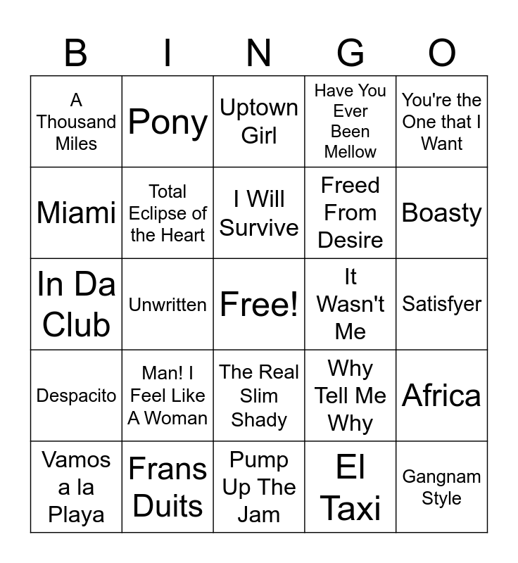 This bingo card has a free space and 41 words: No Limit, In Da Club, Dancing Queen, Total Eclipse of the Heart, Frans Duits, The Real Slim Shady, I Will Survive, Atemlos durch die Nacht, You're the One that I Want, Despacito, Unwritten, Have You Ever Been Mellow, Gangnam Style, Satisfyer, It Wasn't Me, Man! I Feel Like A Woman, Rhytm Is A Dancer, A Thousand Miles, We’re Going To Ibiza, Uptown Girl, Africa, Noodgeval, Pump Up The Jam, Freed From Desire, Vivir Mi Vida, Trompetisto, El Taxi, Hans Betaalt De Schade, Boasty, Walk on Water, Lets Get Loud, Pony, Vamos a la Playa, Volare, Why Tell Me Why, Miami, De Toreador, Engelbewaarder, Zoet, Zout, Zuur, Si Antes Te Hubiera Conocido and Blikkendag.