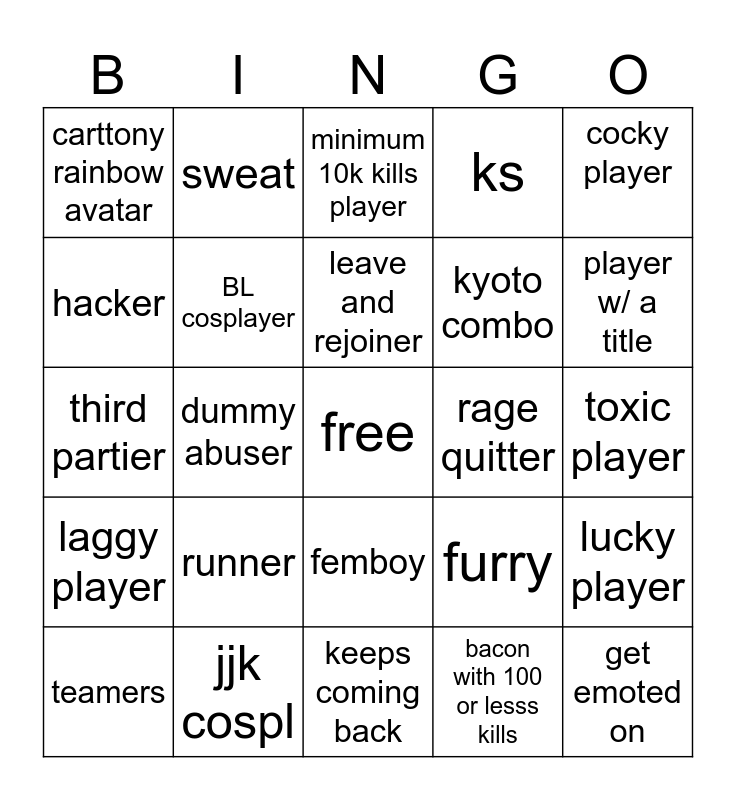 This bingo card has a free space and 24 words: runner, jjk cospl, leave and rejoiner, teamers, cocky player, carttony rainbow avatar, hacker, sweat, rage quitter, femboy, kyoto combo, third partier, furry, lucky player, BL cosplayer, bacon with 100 or lesss kills, toxic player, minimum 10k kills player, player w/ a title, dummy abuser, get emoted on, laggy player, ks and keeps coming back.