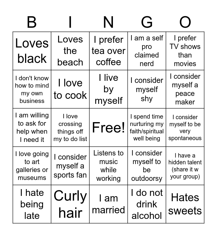 This bingo card has a free space and 44 words: Prefers non-caffeinated drinks, I consider myself a sports fan, I enjoy a good debate, I do not drink alcohol, Speaks more than 1 language, Only child, I love to cook, I would rather talk on the phone than text, I am a self pro claimed nerd, Hates sweets, Loves black, Curly hair, I consider myself to be outdoorsy, I consider myself to be very spontaneous, I like wine more than beer, Halloween is my favorite holiday, I am married, I spend time nurturing my faith/spiritual well being, I have more than 1 pet, I am willing to ask for help when I need it, Loves the beach, Listens to music while working, I consider myself outgoing, I prefer TV shows than movies, Everyone at the table shares an irrational fear, then claim this space, I would rather hang out w a few close friends than go to a party, I live by myself, I practice good self care, I have a hidden talent (share it w your group), I hate being late, I still use my twitter account, I prefer tea over coffee, I love routines in my life, I believe learning never stops, I love going to art galleries or museums, I am an introvert, I am a problem solver rather than a finger pointer, I love direct communication, I consider myself a peace maker, I don't know how to mind my own business, I love crossing things off my to do list, I am an extrovert, I consider myself shy and I worked a part time job in HS.