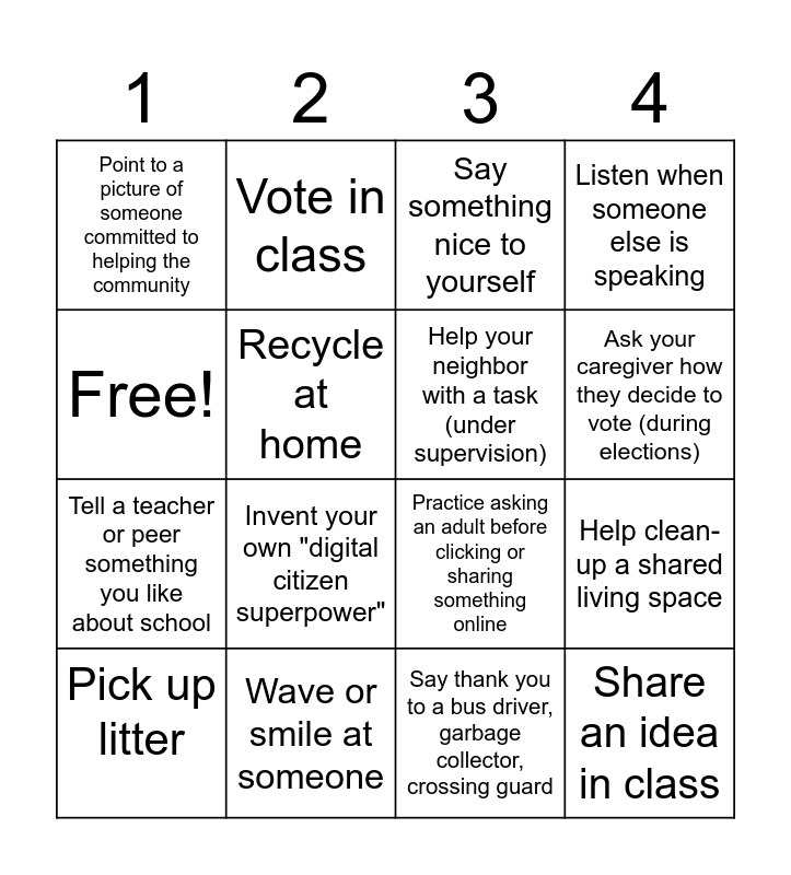 This bingo card has 16 words: Wave or smile at someone, Help clean-up a shared living space, Say something nice to yourself, Point to a picture of someone committed to helping the community, Tell a teacher or peer something you like about school, Vote in class, Practice asking an adult before clicking or sharing something online, Say thank you to a bus driver, garbage collector, crossing guard, Free!, Recycle at home, Pick up litter, Listen when someone else is speaking, Invent your own "digital citizen superpower", Ask your caregiver how they decide to vote (during elections), Help your neighbor with a task (under supervision) and Share an idea in class.