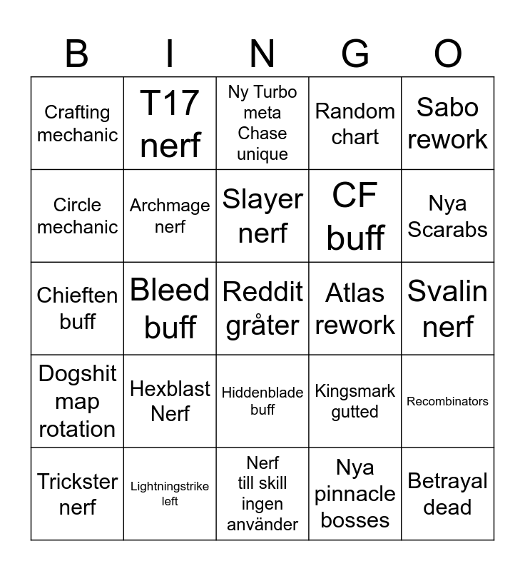 This bingo card has a free space and 24 words: Hexblast Nerf, Lightningstrike left, Slayer nerf, Trickster nerf, Sabo rework, Crafting mechanic, Circle mechanic, T17 nerf, Atlas rework, Hiddenblade buff, CF buff, Chieften buff, Kingsmark gutted, Recombinators, Archmage nerf, Nya pinnacle bosses, Svalin nerf, Ny Turbo meta Chase unique, Nya Scarabs, Bleed buff, Betrayal dead, Dogshit map rotation, Random chart and Nerf till skill ingen använder.