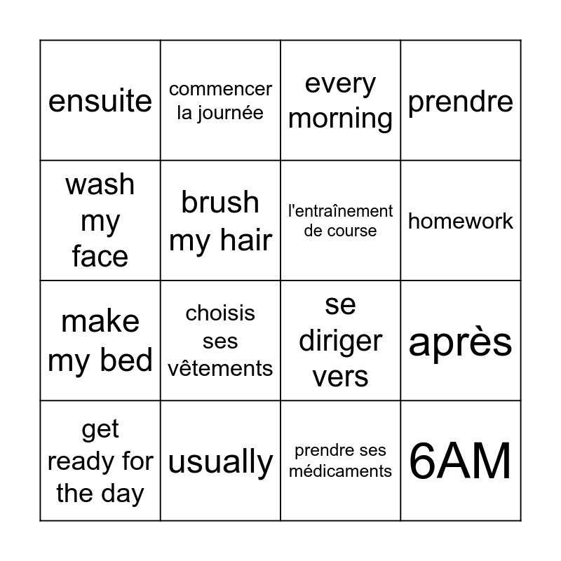 This bingo card has 16 words: usually, après, every morning, ensuite, make my bed, commencer la journée, se diriger vers, prendre ses médicaments, wash my face, brush my hair, get ready for the day, prendre, choisis ses vêtements, homework, l'entraînement de course and 6AM.