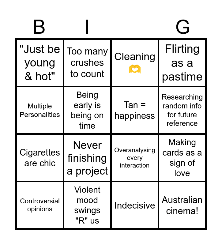 This bingo card has 16 words: Violent mood swings "R" us, Making cards as a sign of love, Cleaning 🫶, "Just be young & hot", Cigarettes are chic, Too many crushes to count, Overanalysing every interaction, Indecisive, Multiple Personalities, Being early is being on time, Controversial opinions, Flirting as a pastime, Never finishing a project, Researching random info for future reference, Tan = happiness and Australian cinema!.